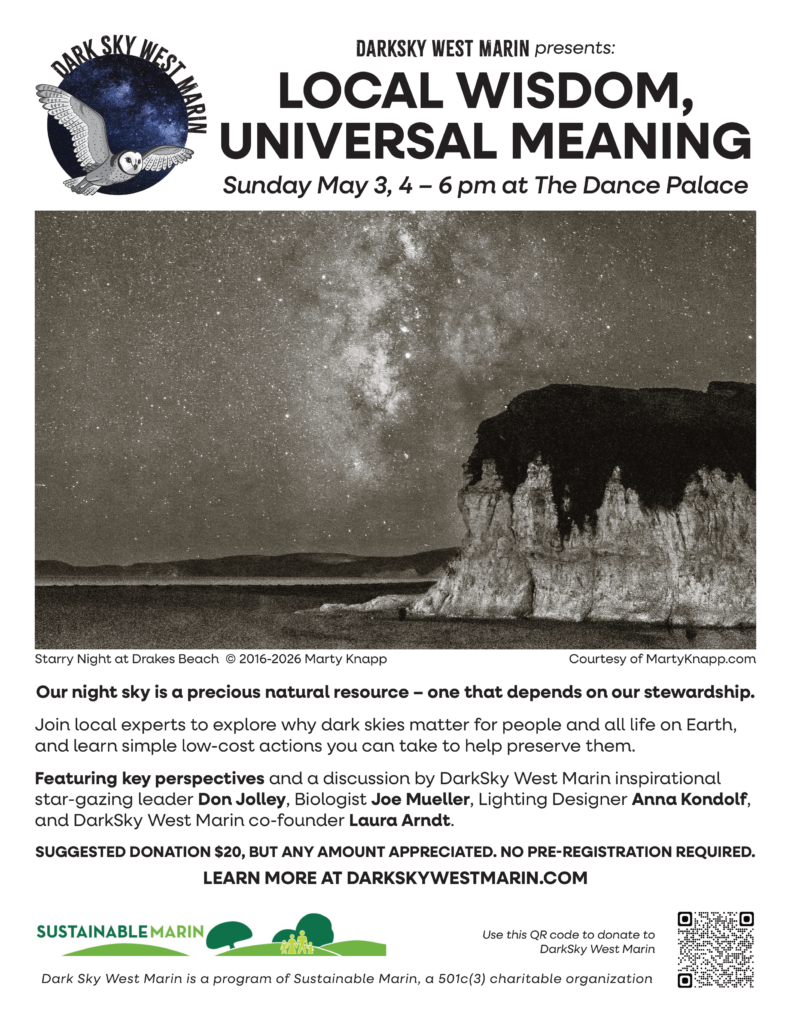 DarkSky West Marin is a community-led initiative dedicated to preserving the night sky in this environmentally rich and uniquely biodiverse region. It is formed by the villages of West Marin diligently working together to become an International “DarkSky West Marin Community.”